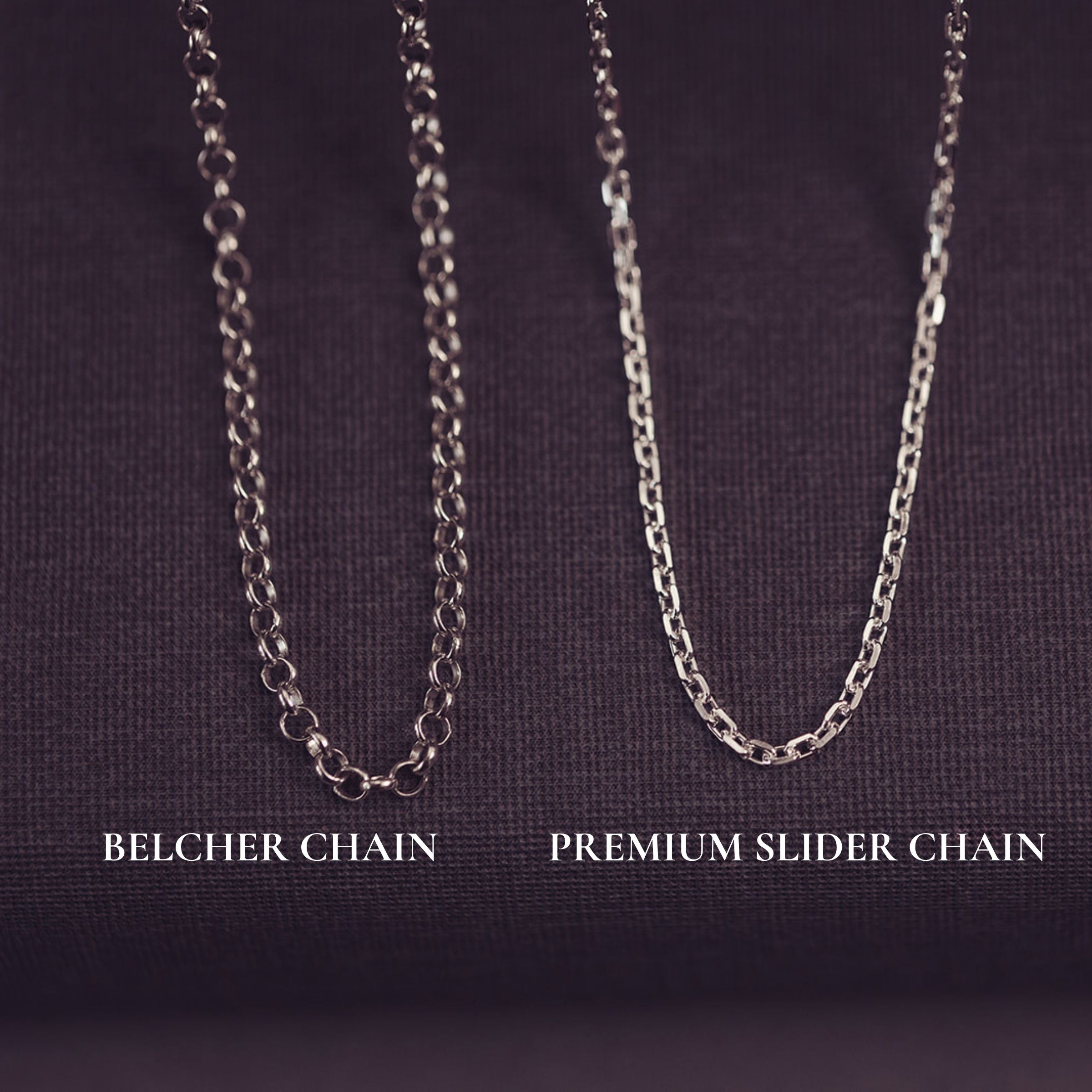 Chain: 16-18" Sterling Silver Belcher Chain (as shown in photographs). We also offer a Premium Slider Chain for more length flexibility. You can view a video showcasing this here.
