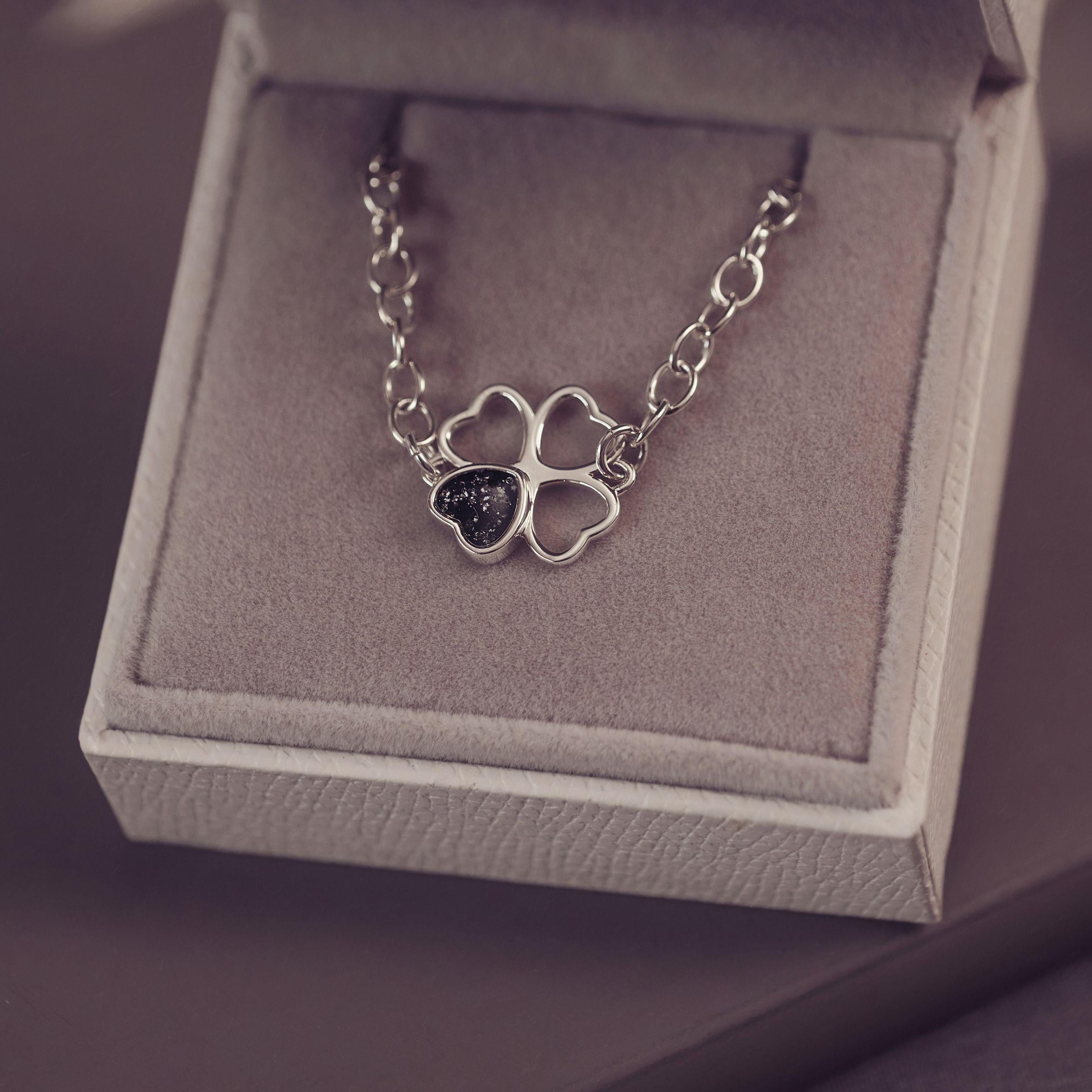 A beautifully unique design, the Cremation Ashes Clover Heart Bracelet holds an elegant clover charm created using cremation ashes from your loved one.