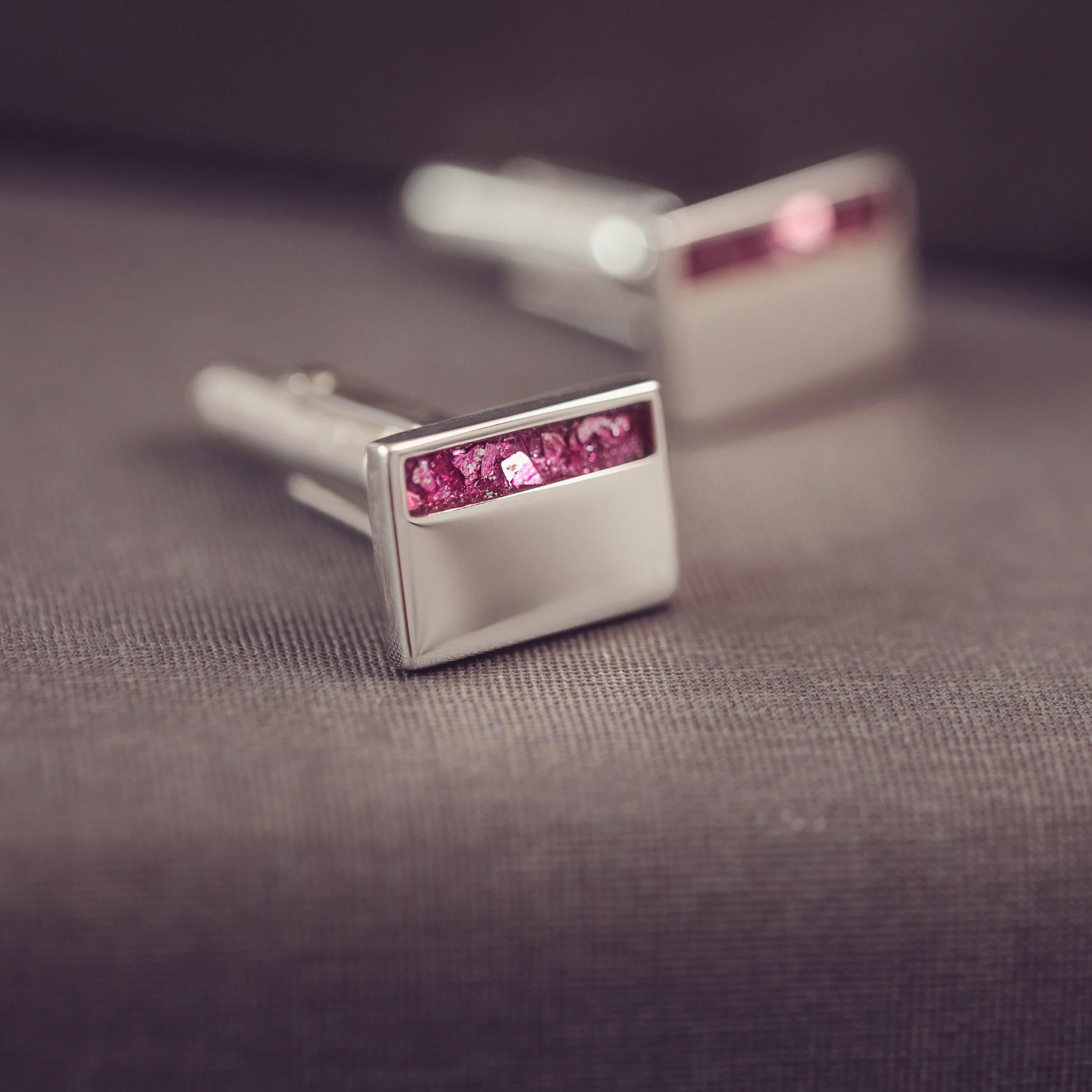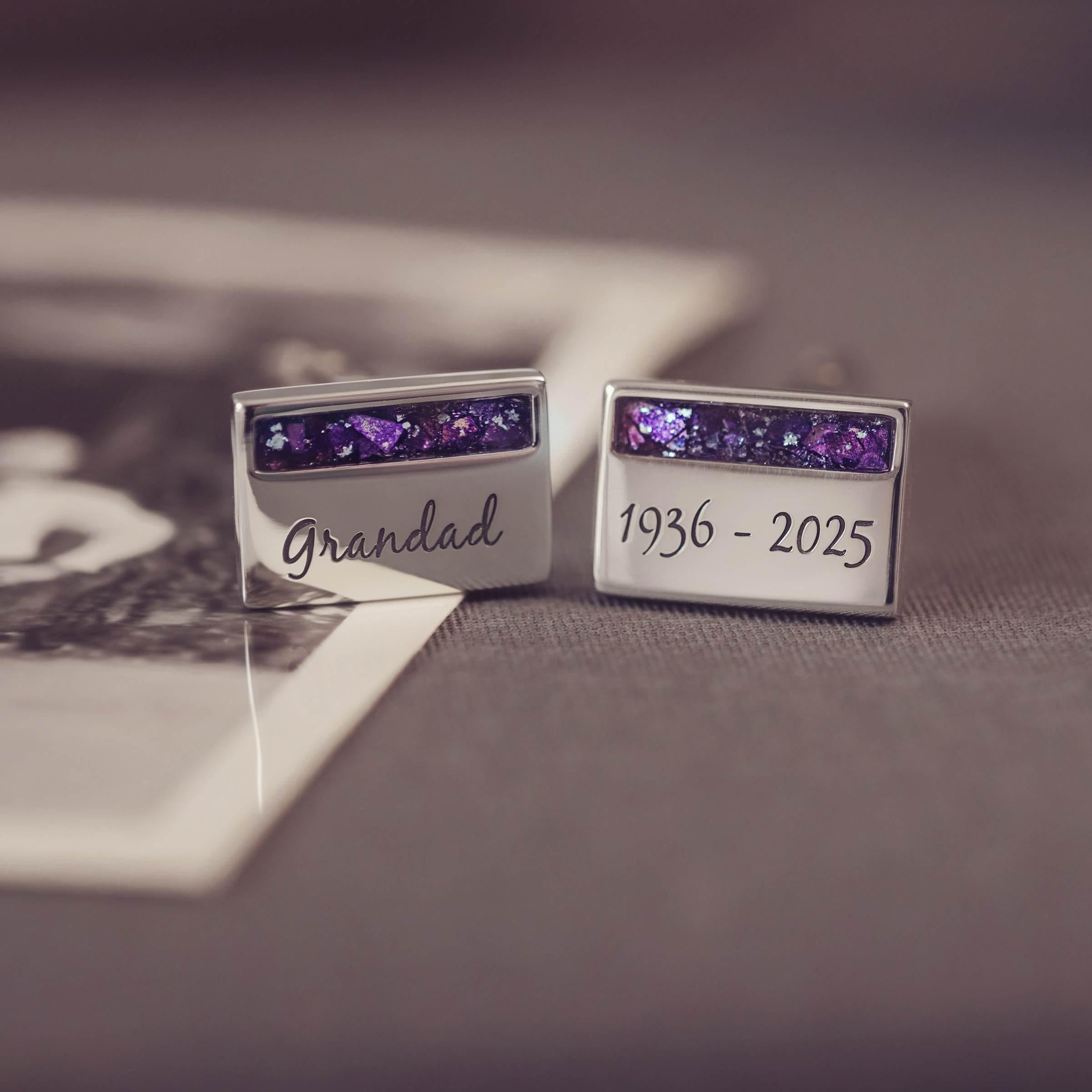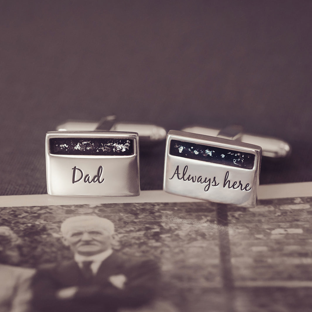 An elegant set of Memorial Cufflinks created using the cremation ashes of your loved one. Each cufflink has a small rectangular section delicately layered with the cremation ashes, coloured crystal pieces, and clear resin to create our signature beautiful floating appearance. You also have the option of adding an engraved message to the front of each cufflink, adding to the uniqueness of your keepsake.