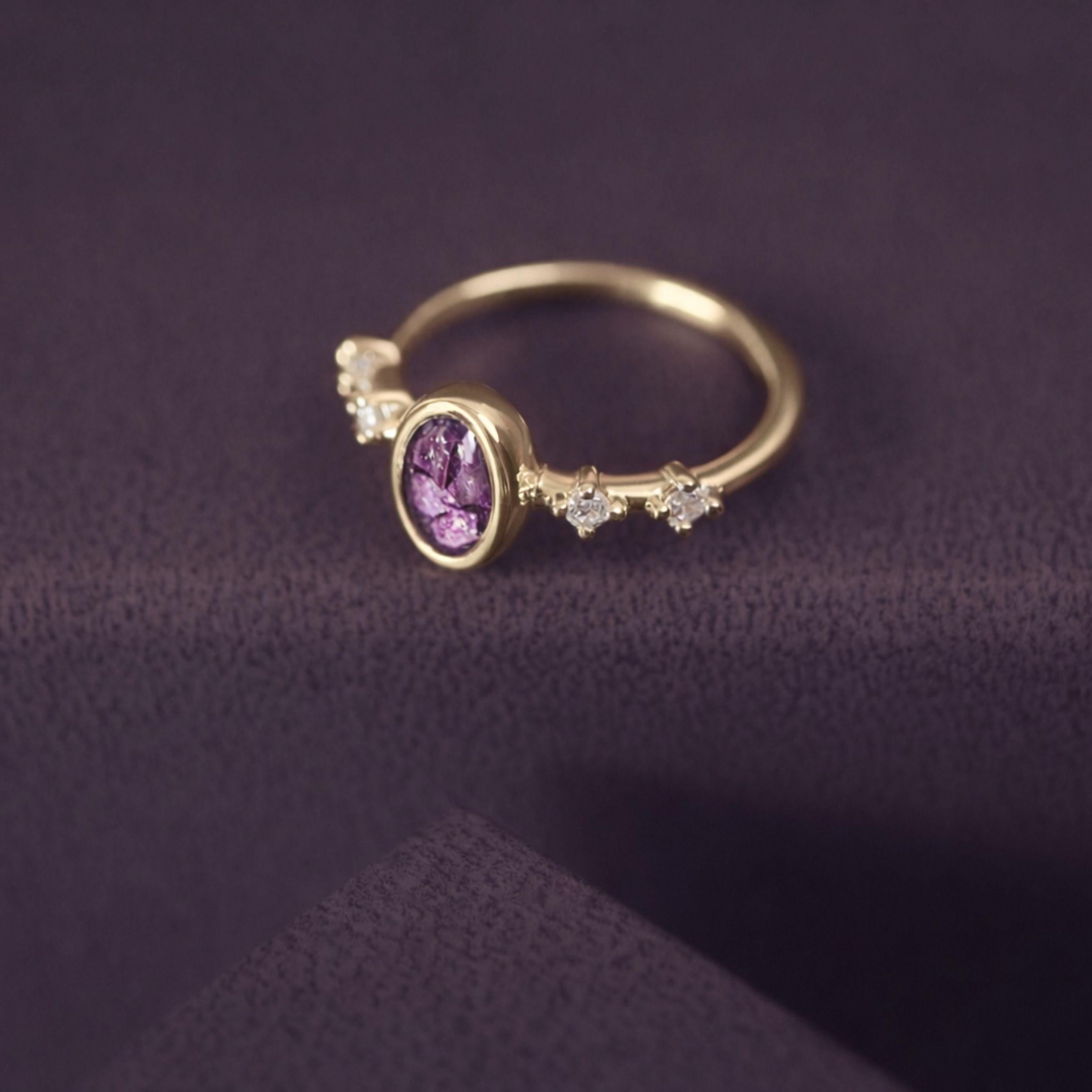 The delicate Gold Oval Memorial Ashes Ring is designed to hold the ashes of a loved one within its elegant setting. Handcrafted in 9ct Gold, this keepsake features an oval stone layered with cremation ashes and crystal chips, within a ring band studded with cubic zirconia gems. Offered in a variety of colours, each ring is presented with an authentication certificate and a luxury Hand on Heart gift box.