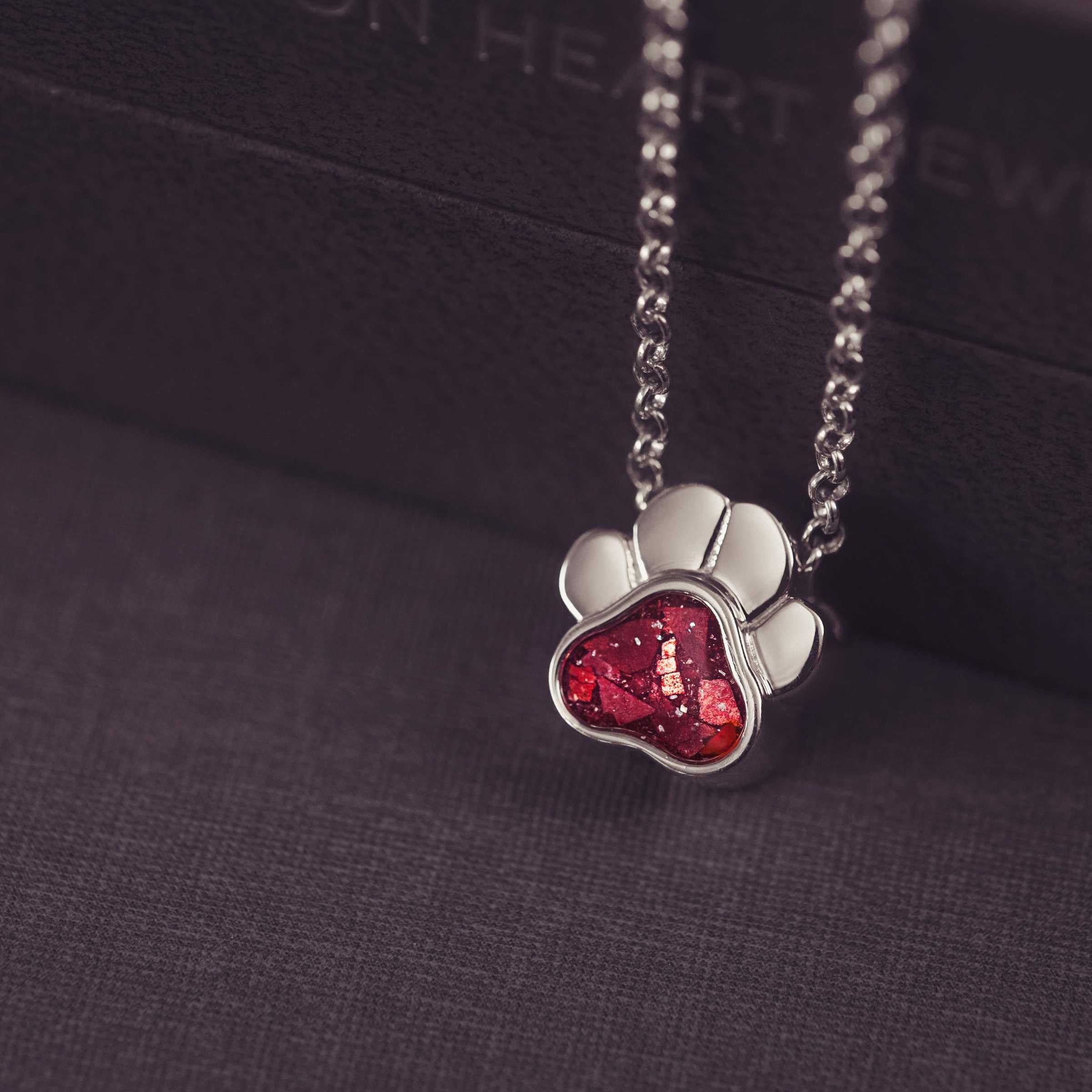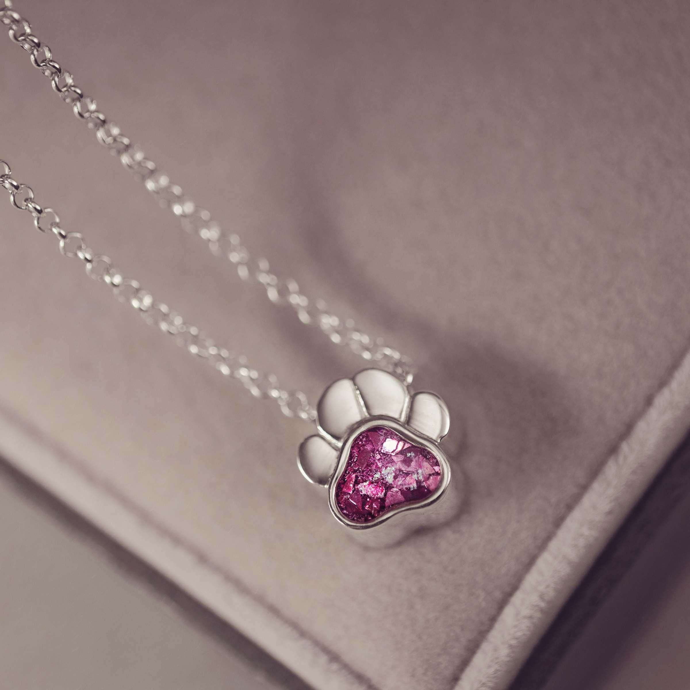 Carry your beloved pet close always with the stunning Cremation Ashes Floating Pawprint Necklace. A beautiful keepsake, expertly crafted using cremation ashes, coloured crystal and resin in a pawprint shaped pendant. This Memorial Ashes Necklace is available in a variety of beautiful colours and floats on a sterling silver belcher chain which can be adjusted between 16-18 inches. The necklace is complemented by a certificate of authenticity and luxury Hand on Heart gift box.