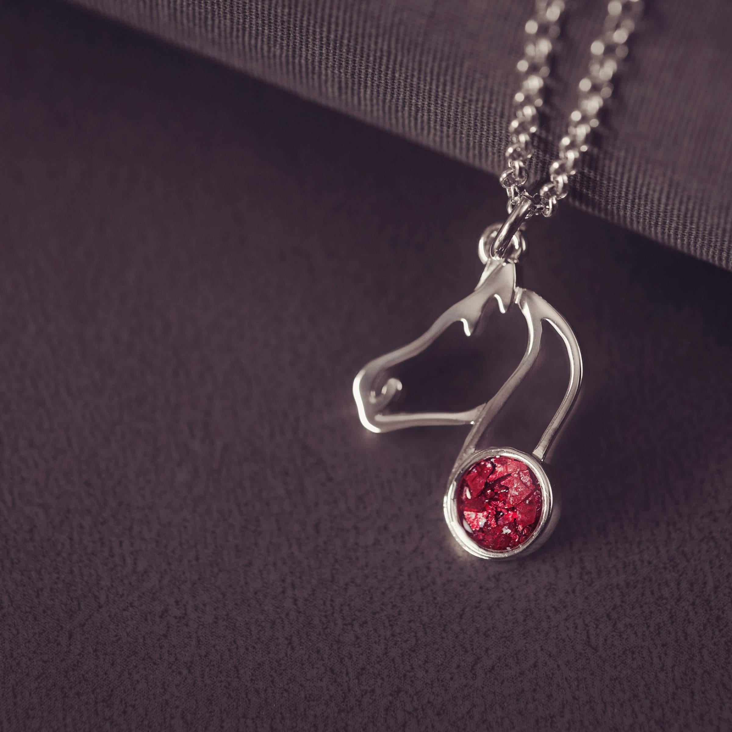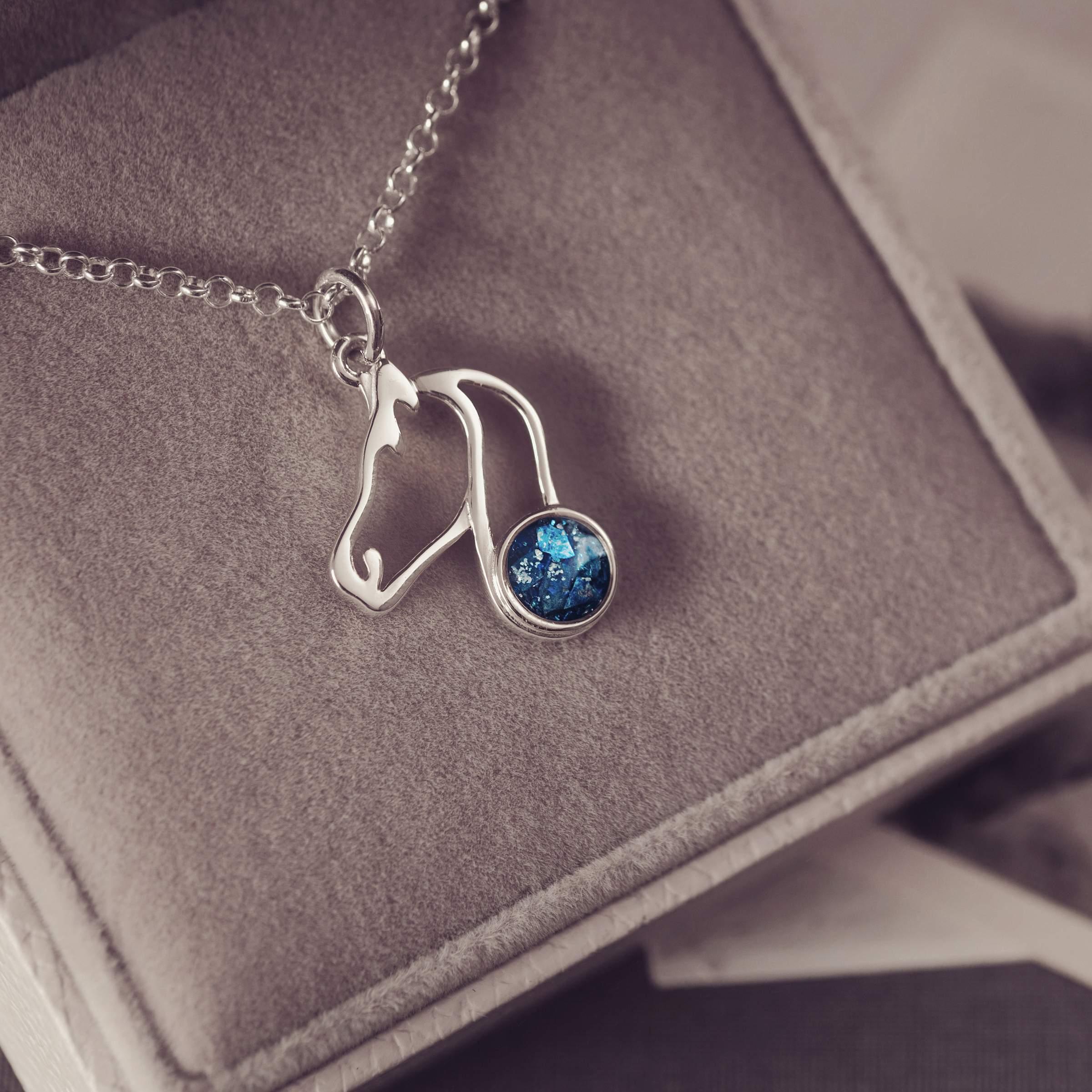 This beautiful Silver Horse Silhouette Necklace is created using the Cremation Ashes of your loved one. The sterling silver charm is carefully layered with resin containing the Ashes to achieve a beautiful floating appearance. Available in an array of colours, the pendant comes complete with an 16-18" sterling silver chain, an authentication certificate and beautiful gift box.