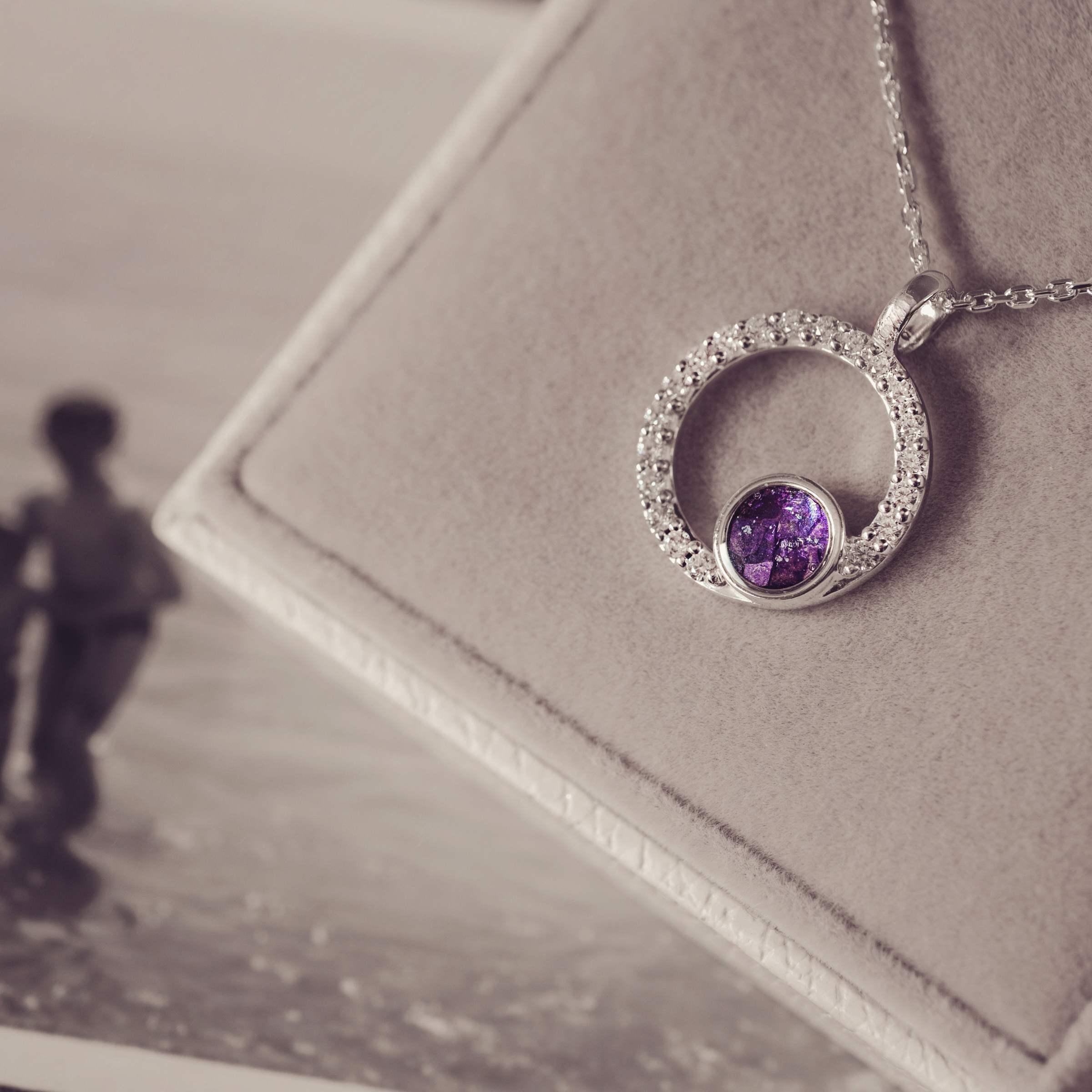 Elegant and timeless, our Luxe Full Circle Memorial Ashes Necklace is designed to hold your loved ones close. The centre of the pendant is filled with cremation ashes in a colour of your choice, encircled by twenty sparkling round-cut cubic zirconia stones to create a continuous ring of brilliance. Part of our Luxe Range, this necklace is crafted with exceptional detail and sparkle, symbolising eternal love and remembrance. Available in a range of beautiful colours, it floats on a premium sterling silver chain, adjustable up to 24 inches. Each piece is completed with a certificate of authenticity and presented in a luxury Hand on Heart gift box.