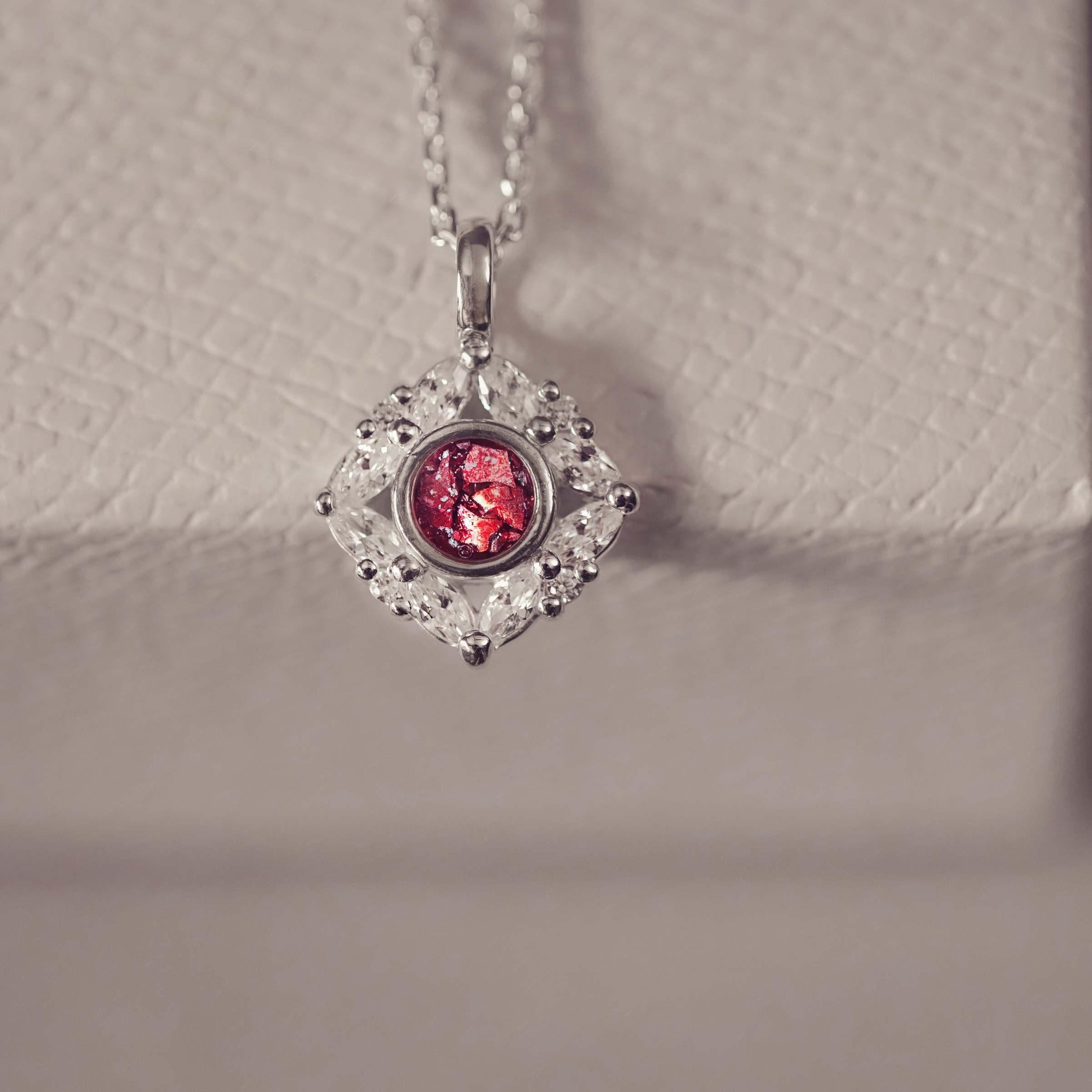 A beautiful new design, our Luxe Memorial Ashes Marquise Cluster Necklace is created to keep your loved ones close to your heart. The centre of the pendant is filled with cremation ashes in a colour of your choice, surrounded by eight sparkling marquise-cut cubic zirconia stones and four round cubic zirconia stones for a striking cluster finish. Part of our Luxe Range, this necklace is crafted with a higher of detail and brilliance by skilled Stone Setters, designed to feel truly special and showcase the finest sparkle. Available in a range of beautiful colours, it floats on a premium sterling silver chain, adjustable up to 24 inches. Each piece is completed with a certificate of authenticity and presented in a luxury Hand on Heart gift box.