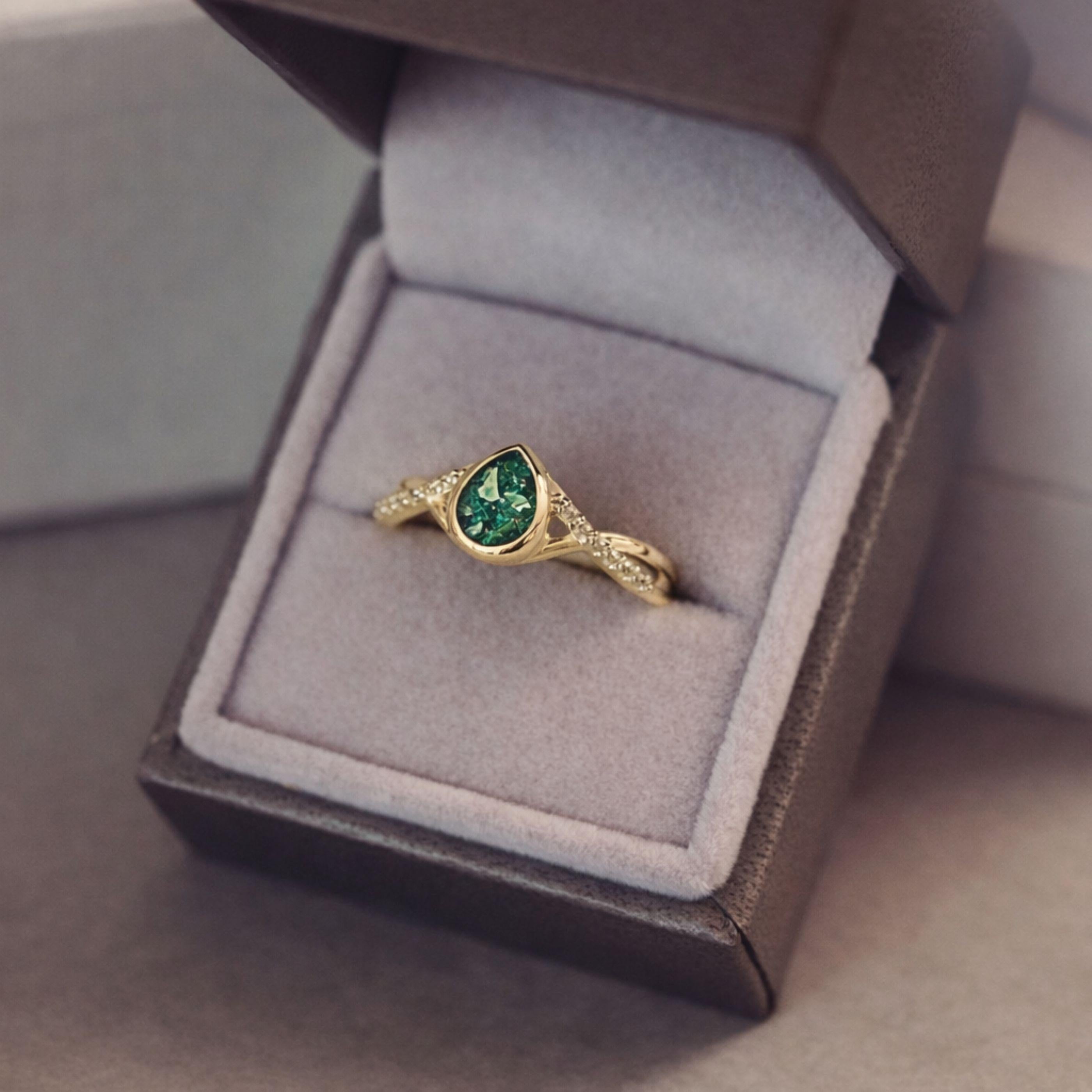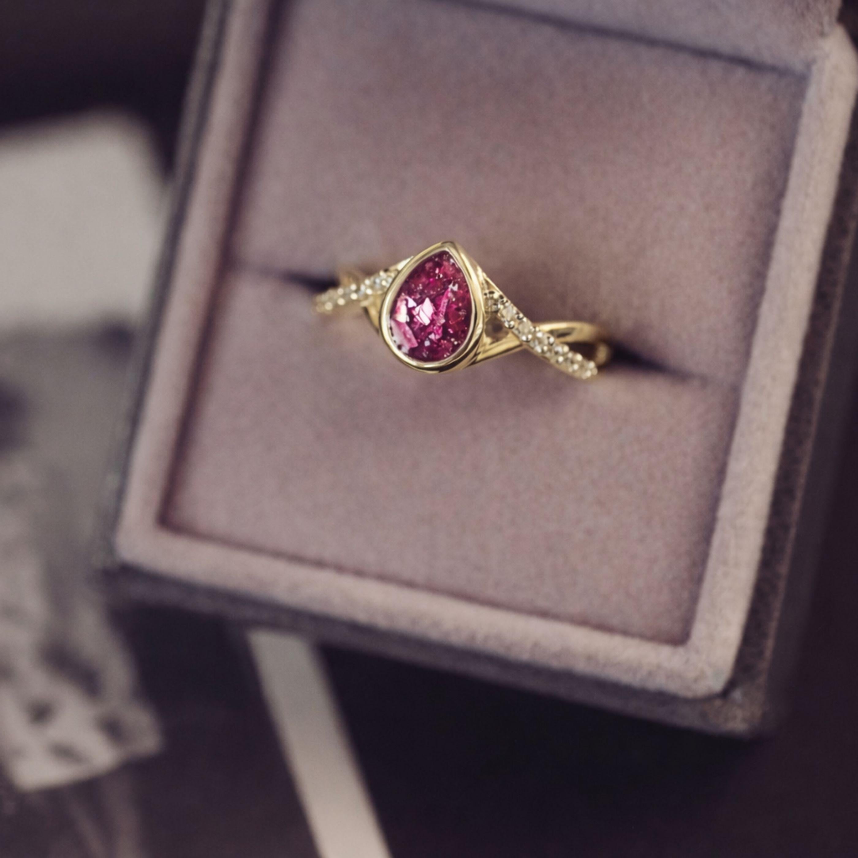 A stunning keepsake, our Gold Memorial Ashes Twist Peardrop Ring is designed to hold the ashes of a loved one within its elegant peardrop-shaped setting. Handcrafted in 9ct hallmarked gold, this delicate ring features a beautiful stone layered with cremation ashes and crystal, beautifully complemented by a gracefully twisted band adorned with sparkling gemstones.