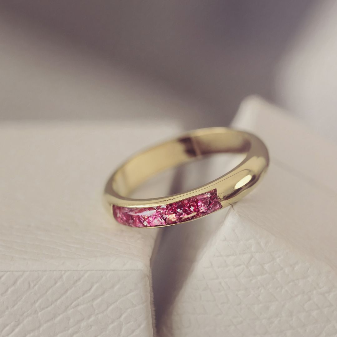A beautiful 9ct Solid Gold ring, lovingly crafted to hold the Cremation Ashes of your loved one. A section of the band is delicately inlaid with our signature floating ashes, coloured in the shade of your choice.