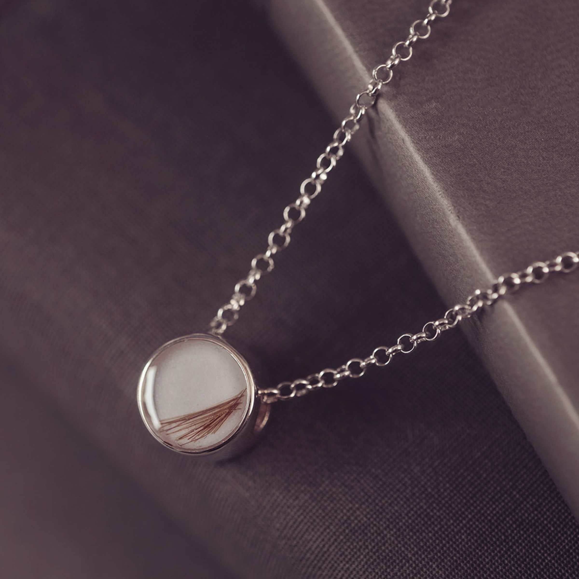 Crafted with love, this elegant, round-shaped necklace features a lock of hair from your loved one. The pendant, made of sterling silver, is meticulously layered with a resin blend containing the hair to achieve a stunning floating effect. The pendant is accompanied by a sterling silver chain that can be adjusted between 16-18 inches. Additionally, the piece comes with a certificate of authenticity and is elegantly packaged in a beautiful gift box. Please note: Hair varies greatly in colour, thickness and pigmentation, and this affects how it appears once preserved. Darker hair is typically more visible, whereas very fair, grey or white hair may appear faint or almost transparent when set. This is a natural outcome of the material itself and not a fault in the finished piece. Please note that the samples shown in the imagery of this design have been made using Mid-Dark hair.