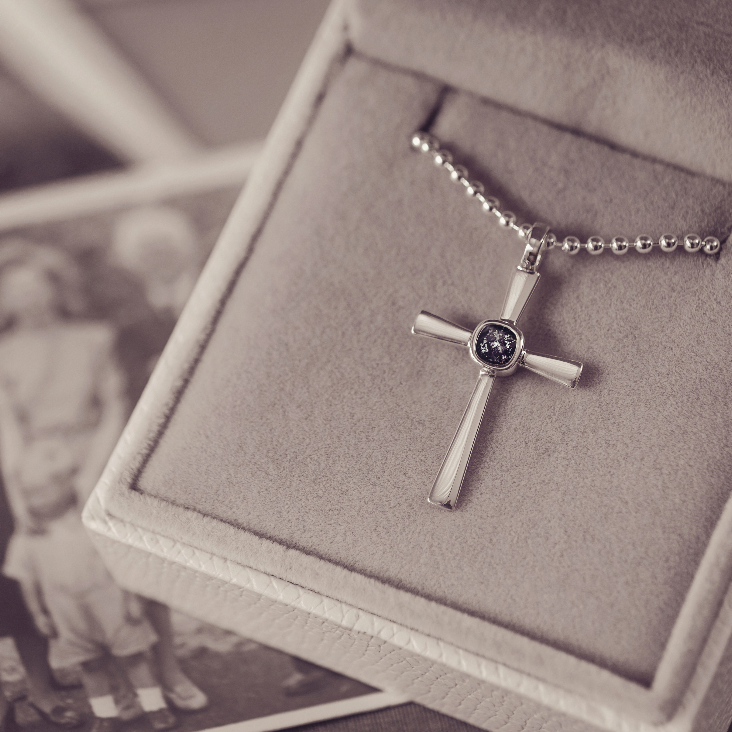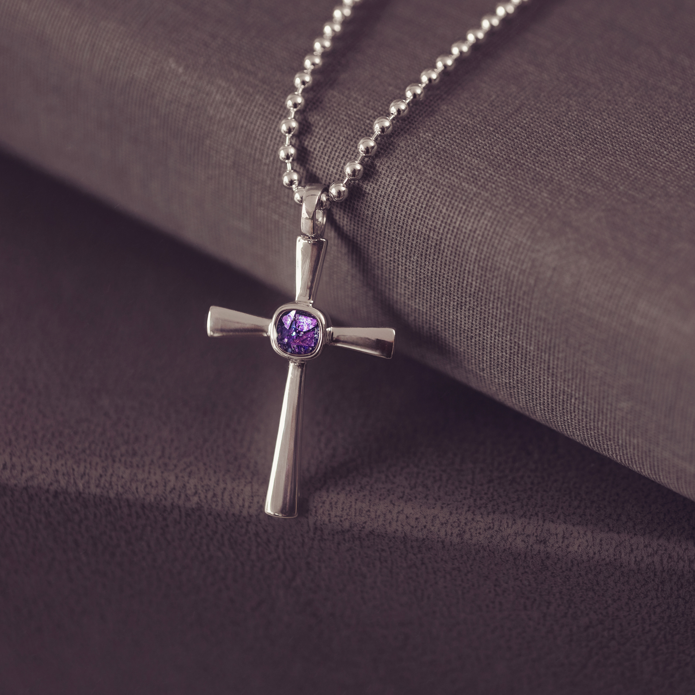 The Cremation Ashes Cross Necklace is created to discreetly hold the Cremation Ashes of your loved one. The centre of the sterling silver pendant is meticulously layered with resin infused with the ashes. Offered in a variety of colours, the pendant is paired with a 22" sterling silver ball chain. Each order is completed with an authentication certificate and elegantly packaged in a beautiful gift box.