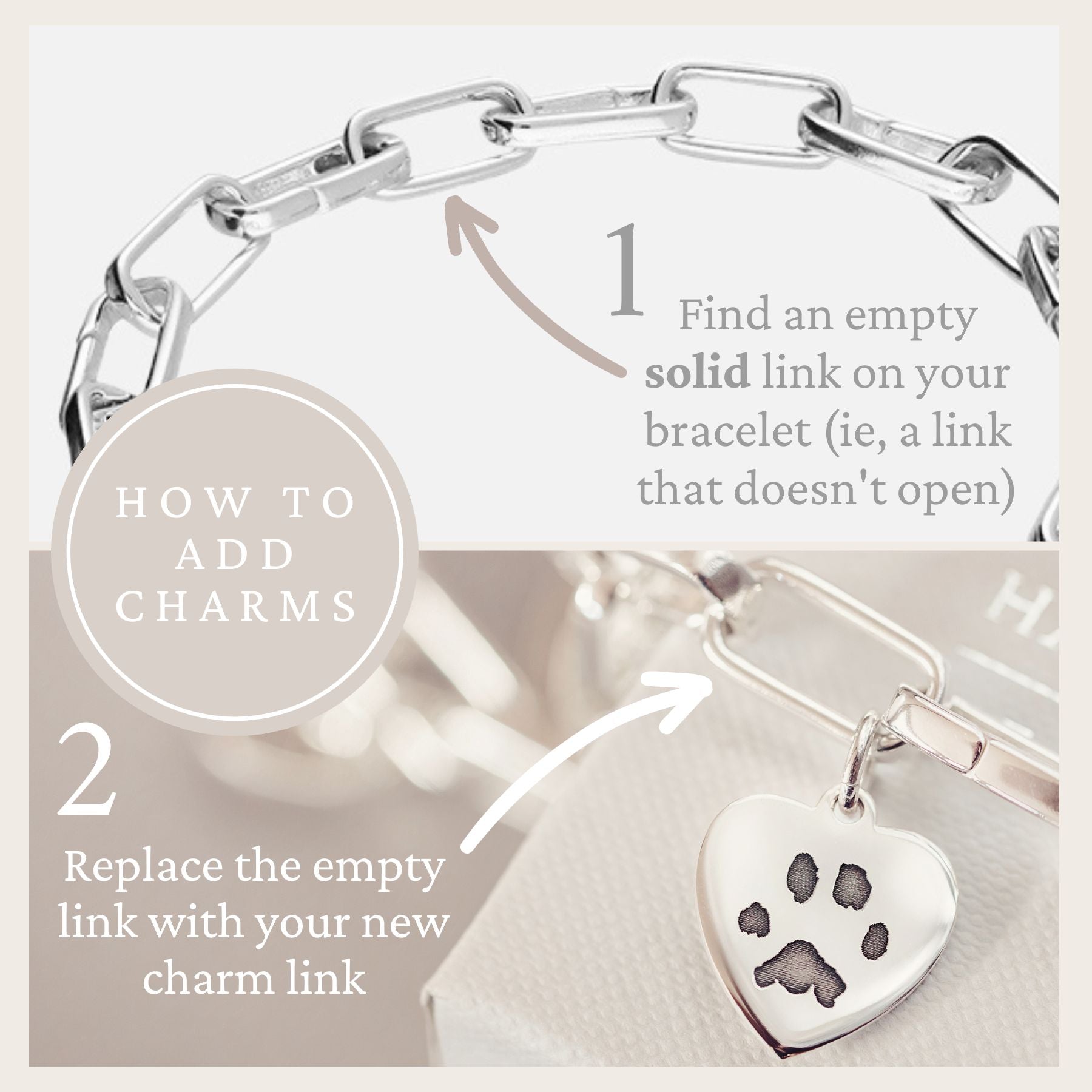 A beautiful Pawprint Charm designed to fit our Collection Bracelet. Add to your Collection Bracelet (sold separately) by simply swapping one of the links for your charm. If purchasing at the same time as a bracelet, we can attach the charm for you.