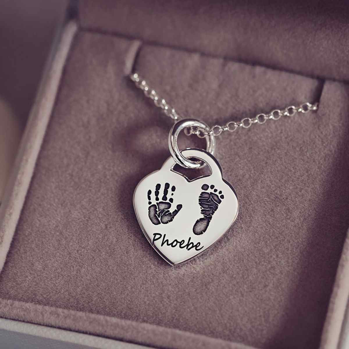 We're absolutely delighted to welcome our Handprint or Footprint Lock Heart Necklace to our range. This new design is from our Imprinted Range which comes with a no-fade lifetime guarantee. Designed in a distinct 'lock heart' shape with a bridge across the top of the heart, this lovely necklace is imprinted with two prints and a name on the front and a personalised message of your choice on the reverse. You can either supply us with the hand or footprints that you may already have, or request a free Magic Printing Kit when you order. All of our Imprinted Jewellery comes complete with a copy of the prints used to create your piece.