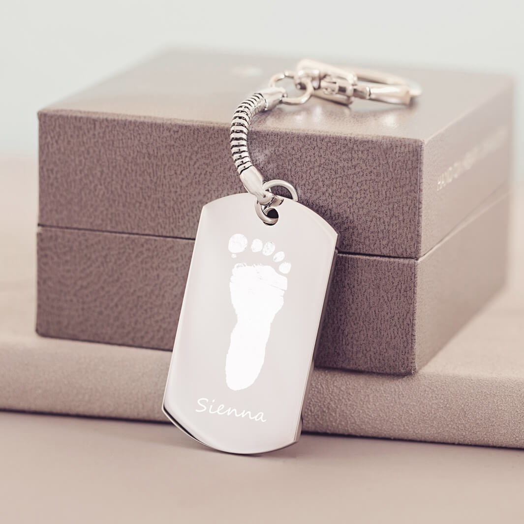 ONLY AVAILABLE WITH QUALIFYING DESIGNS. A special offer keyring featuring the same print and name as on your qualifying piece of jewellery.