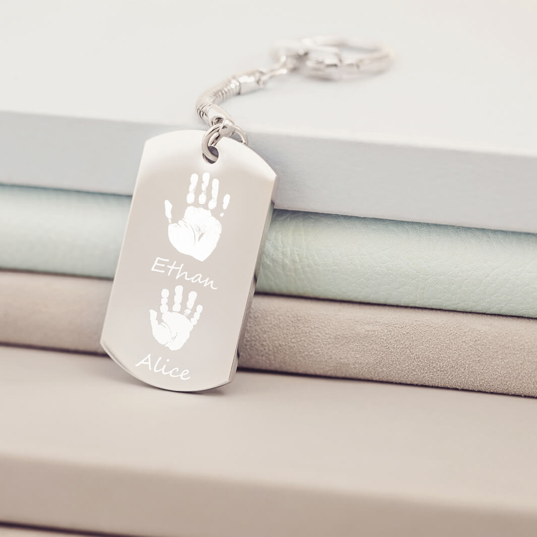 ONLY AVAILABLE WITH QUALIFYING DESIGNS. A special offer keyring featuring the same prints and names as on your qualifying piece of jewellery.